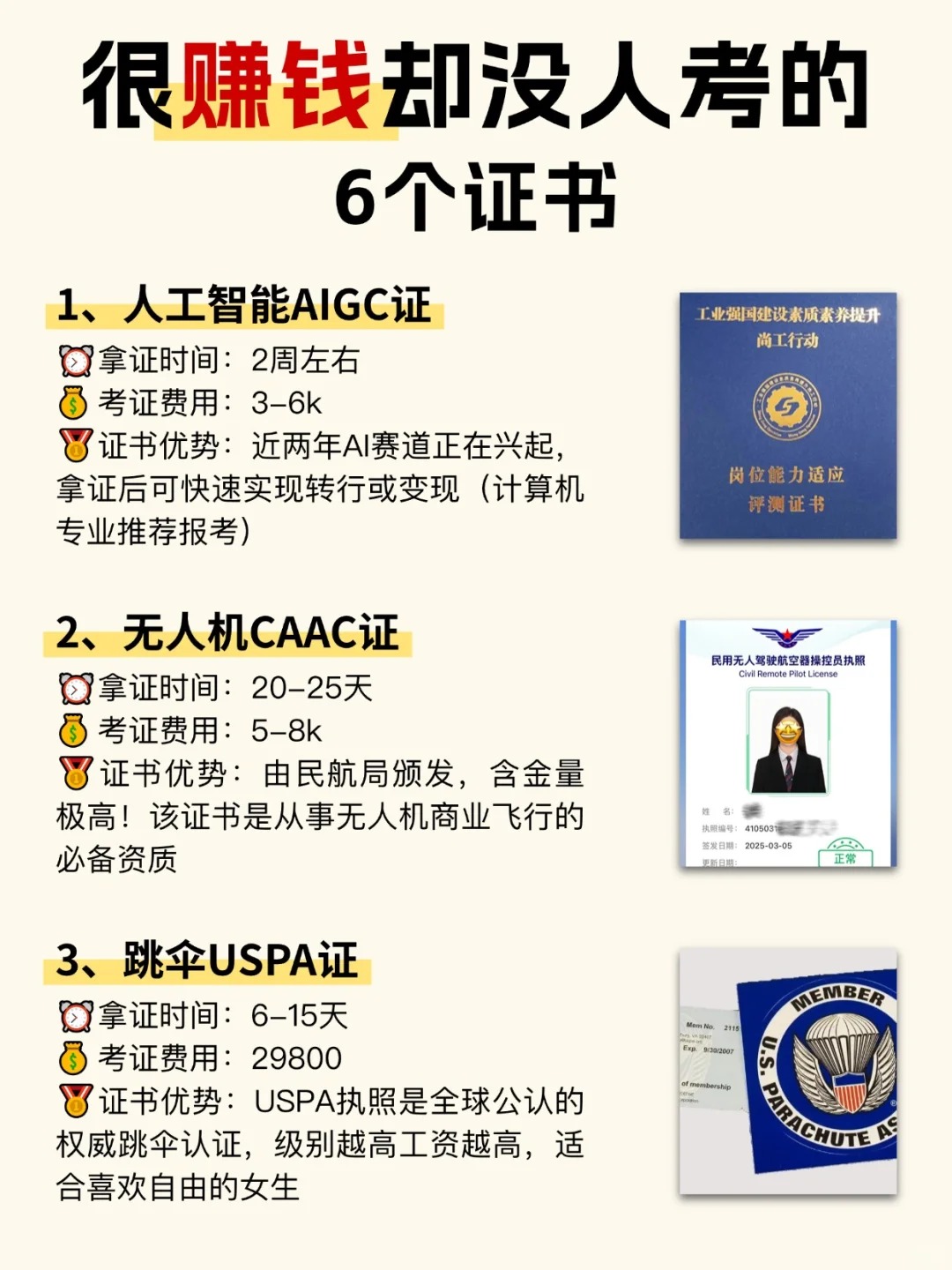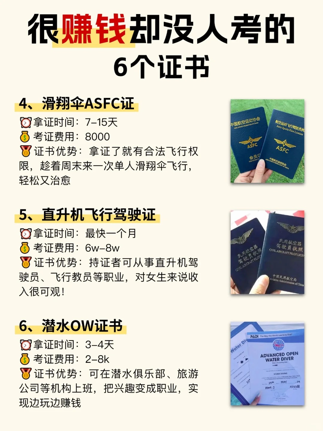 普通人该怎么提升自己?那就是打破常规加入新的赛道❗今天给大家整理了6个很赚钱但没人考的证书刷到了就存下吧🌟.❶人工智能AIGC证❷无人机CAAC证❸跳伞USPA证❹滑翔伞ASFC证❺直升机飞行驾驶证❻潜水OW证